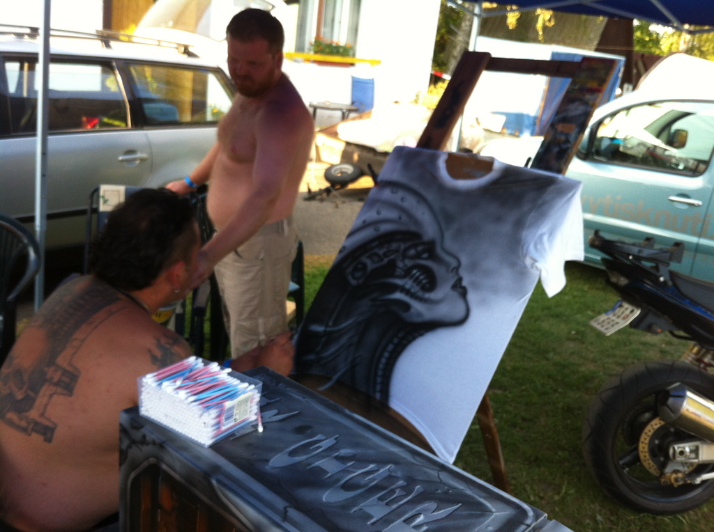 Tak na začátku týdne bych začal v AM lehce a to malou reportáží po té naší týdenní dovolence. Petra Šeberu znám již mnoho let. Nejprve jsme se seznámili díky webu a příspěvkům na staré verzi AirNews.cz a později se setkali i na motosrazech, na Airbrush Art Festivalu atd. Už jsem ho neviděl celé roky. Boom s airbrushem díky krizi pomalu padá a lidé hodně dlouho přemýšlí, než do malby na svého miláčka půjdou. A tak se pomalu po Žerotíně procházím, obdivuji motocykly na jednom z největších srazů v okolí a za rohem kde tetoval Petr Šulc z Colorshock jsem našel člověka, který dělal malbu na tričko a byl obklopený obrazy, helmou, motocyklem, kompresorem a měl biomechanické tetování na zádech.