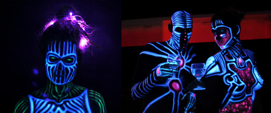 Po téměř roční pauze opět navazujeme na sérii rozhovorů mapující dění na české psytrancové scéně. Tentokrát přinášíme v rámci série Na kus řeci rozhovor s výtvarníkem, s jehož tvorbou se setkáváte na českých parties a festivalech. Alienjedna zaujal v poslední době zejména svým UV bodypaintingem, o kterém si s ním povídala Kermix. Zabýváš se malbou UV aktivním akrylem, v čem je odlišnost od běžných akrylových barev? Hlavní odlišnost tkví v tom, že barva pod UV zářením začne svítit. Její vlastností je to, že přijme pro lidské oko neviditelné UV záření, zpět ovšem odrazí světlo jiné vlnové délky, které už není v oblasti UV ale viditelného spektra.