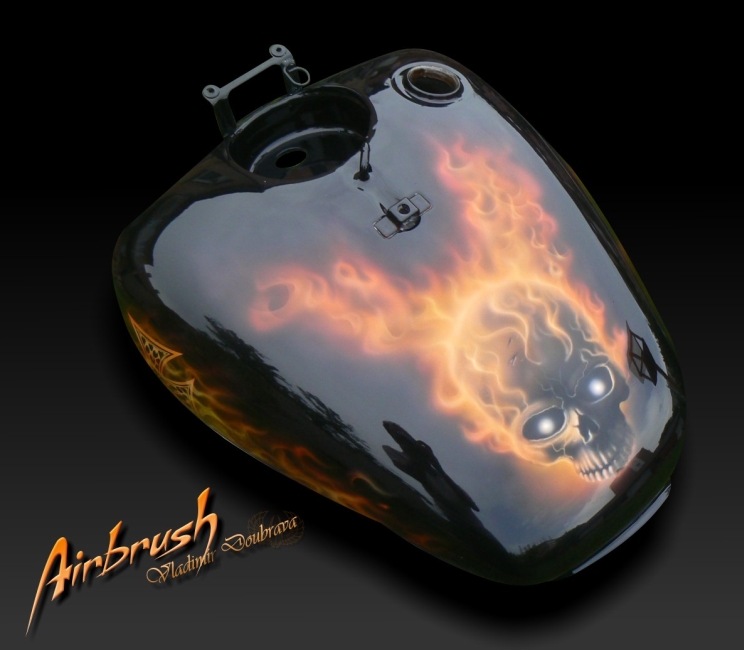 I když o tom neradi kluci píší, patří to sem také a tak o tom pár slov. Kolotočařina, je to umění nebo ne? Asi ano, patří to však do kategorie atrakcí, stejně jako výzdoba houpadel v Kauflandu či Tescu. Custom flames to sice nejsou, ale airbrush to je. Řekne-li se Airbrush, není to vlastně nic jiného, než malování pomocí stříkacích pistolí s různými průměry stříkacích trysek. Tato technika malby je známá již více než 100 let. Tento způsob malby je ale povětšinou kombinací více malířských technik. Osobně si ale myslím, že není důležité jakým způsobem se malba provádí, protože nejdůležitější je výsledek a ten vás zajímá určitě nejvíce. Jediné, co si určitě každý malíř ať už jakékoliv techniky neodpustí vyzvednout je ten fakt, že se jedná o RUČNÍ PRÁCI - nic nemaluje stroj, ale vše spočívá na zkušenostech a umu každého malíře.