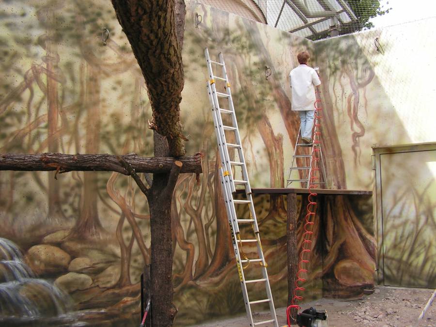 Po nedávném Airbrush Art Festivalu v pražských Holešovicích, kde předváděl své umění za použití stříkací pistole také člen Spolku podkrkonošských výtvarníků Roman Schroll, stál tento trutnovský malíř před další nevšední výzvou - vymalovat technikou airbrush rodící se pavilon orangutanů v královédvorské zoo. „Na začátku jara mi ze zoo volala tamní výtvarnice Jitka Mašínová, která se už třicet roků podílí na výtvarné podobě zahrady a dvacet let se zabývá technikou airbrush. Dostal se ji totiž do rukou magazín Trutnovinky, který ji přinesl její profesor francouzštiny. Přečetla si rozhovor se mnou a zaujalo ji to, čím se zabývám – technikou airbrush,“ řekl Schroll.