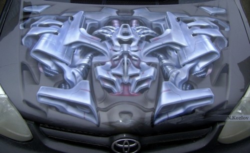 Měli jsme tu samé ukázky malby na plátna a pozapomnělo se na to hlavní, na airbrush na plechu pod lakem. Po sérii článků a postupů, přileb a motodílů bylo hodně příspěvků o malování na tělo a pak ilustrace na plátně. Je to jiný způsob techniky i použitých materiálů a tak se dnes podíváme na klasický airbrush pod lakem na kapotě automobilu. Vynecháme přípravu a práci lakýrníka, zaměříme se na práci s malbou.