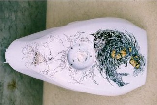 Pokud se rozhodnete pro airbrush,musím přidat vlastní historku. Po výběru z mnoha dílen, které se malováním zabývají musíte vše projednat s daným umělcem. Z osobní zkušenosti mohu doporučit probrat budoucí vzhled motocyklu nad sklenkou něčeho destilovaného. Pomůže to představivosti a rozjede fantazii, pozor však na množství. Snadno se může stát, že si ráno už jen matně pamatujete, jak jste chtěli mít na nádrži krásný decentní Bar&Shield a v tom vám dotyčný umělec volá a ptá se: „Hele a na tom kufru si chtěl mít tu pinupku blond nebo brunetku?“