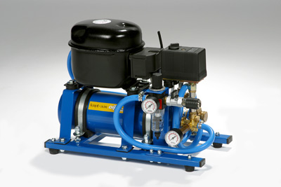 Ke stavbě tohoto kompresoru mě vedly následující potřeby a omezení : 1. – cena koupeného profi kompresoru je cca. 10.000,- Kč a výše, 2. – mít kompresor víceúčelový , 3. – mít kompresor tichý (bydlím v paneláku a modelařím většinou v noci), 4. – mít kompresor, který funguje bez další obsluhy. Ke stavbě potřebujete vyřazenou ledničku, vyřazený hasící přístroj a dobrého kamaráda se svářečkou. Rám celého zařízení je svařen z kovových profilů, které vám v každém solidním železářství strojově nařežou na míru ( cca. 100,- Kč včetně nařezání). Tlaková láhev je ze starého hasícího přístroje, vlastní kompresor ze staré ledničky.Takové kompresory dávají až 15 atmosfér. Jednotlivé díly jsou pískovány a opatřeny vypalovací práškovou barvou. Do ovládací hlavice hasičáku je v místě výfuku hasiva vyvrtán závit G1/4“.