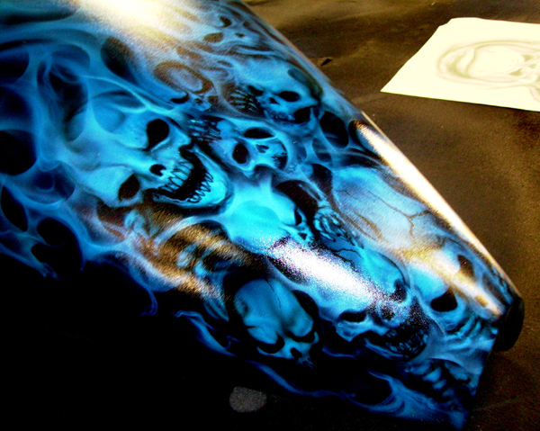 Pro ty s Vás, kteří zápolíte s airbrushem, začínáte, učíte se, nebo jen hledáte něco nového bych měl novinku. Jedná se o projekt, který je určen k dekoraci a je dokumentován krok za krokem. V doslovném postupu se dozvíme, jak postupovat s výrobou a aplikací masky, v jakém sledu vrstvit barvy na sebe a jak postupovat pomocí triků, na které si postupně zvykne snad každý výtvarník a grafik. Získané znalosti a vědomosti jdou později uplatnit na jakémkoliv povrchu a s jinou předlohou. Pokud má někdo rád temná témata, plameny, lebky, nebo podobná hořící mrtvá monstra, je tento postup určený právě pro něj. Na co provedeme v dnešní lekci malbu?