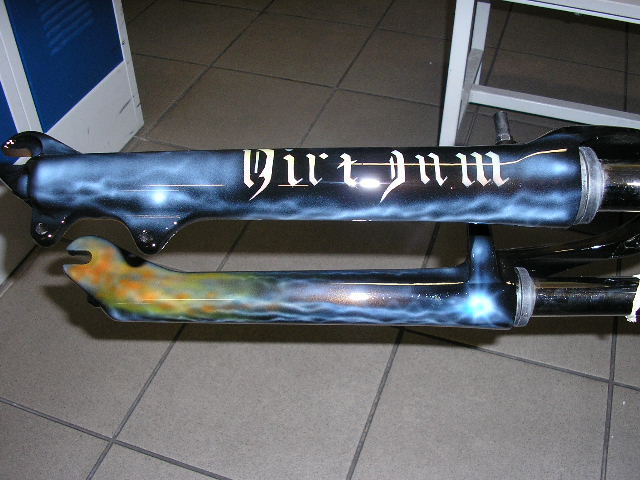 Každopádně situace byla taková, že jsem měl dílenský kompresor,ale kromě pistole na velké plochy nebyla žádná retuš ani jednoduchá fixírka na efekty. Ale já jsem je dělat chtěl. Rozhodnutí koupit retuš jsem měl až později, zato byla spousta práce s lakováním velkých ploch,automobilů,motocyklů a všeho možného. Na snímku je přední vidlice z kola s grafickým designem, níže v článku popis a foto Škoda 105 s airbrush motivem lebky.